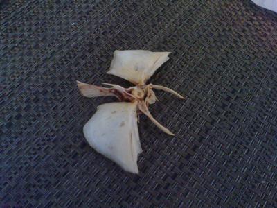 Der Besitzer erzählte mir, zu Weihnachten habe es stets Karpfen gegeben, der, als er noch in der Badewanne schwamm, um recht frisch zu bleiben, dort schon einige kindliche Taufen erhalten hatte. Als er schließlich aber als Festmahl zubereitet gewesen sei, habe man die Knochen des Backens genommen und sorgfältig von des Fisches Fleisch befreit. Sprich: „ausgezuckelt“. Beide Backenknochen des Karpfens hielten als nächstes als Flügel des „heiligen Geistes“ her. Der Körper? Ganz einfach: Dieser war der erste Wirbel der Wirbelsäule und die daran angewachsenen Rippen, welche die Arme oder Beine darstellten. Nun setzte man die drei Teile zusammen, immer bedacht darauf, dass sie im Gleichgewicht halten, band ein Fädchen darum und hängte den so entstandenen heiligen Geist an der Lampe über dem Tisch auf.